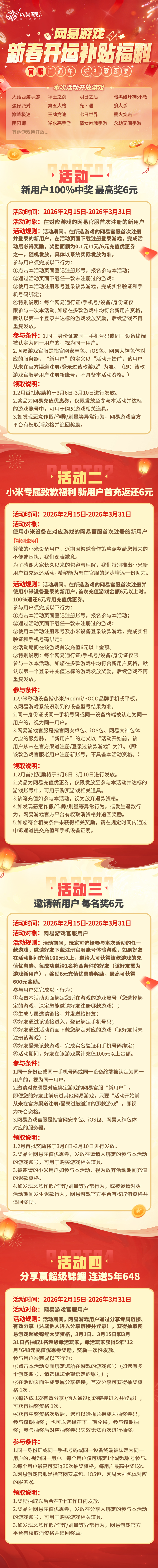 2月15日到3月31日,网易游戏新春开运补贴福利活动正式上线,四重福利排排坐,新老朋友都能上车!